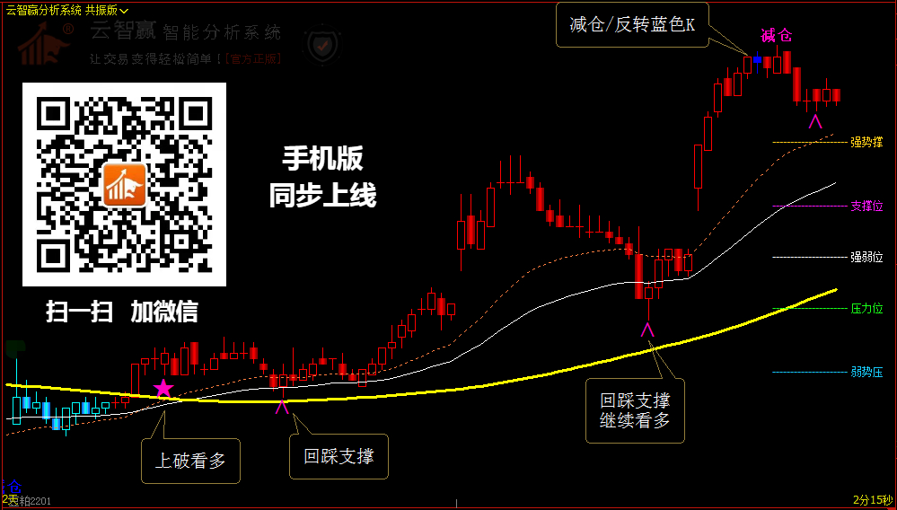 【云智贏】分析系統,是一款以分析為主,策略為輔的系統分析軟件,全方位適用于所有市場行情,能夠提示支撐和壓力區間位置、高低位預警輔助信號,分析策略建議等,幫您規避很多震蕩行情,提高對行情的把控力,有效提高您盯盤的效率。讓行情分析不再難做!